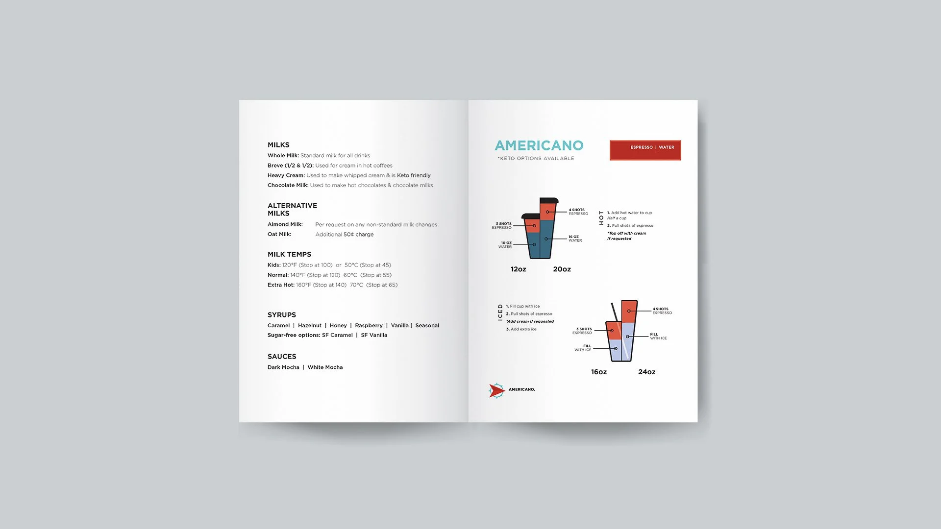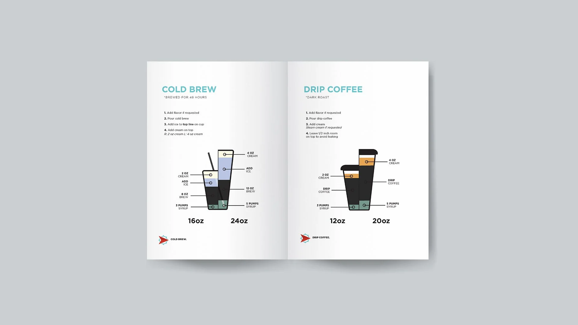 Caffe Globe Barista Guide is a book to teach new baristas what drinks are offered at the cafe and how to make the drinks. The goal was to have the steps listed with correlating graphics to help the new barista comprehend the menu very easily and have clear steps how to make the beverages.
