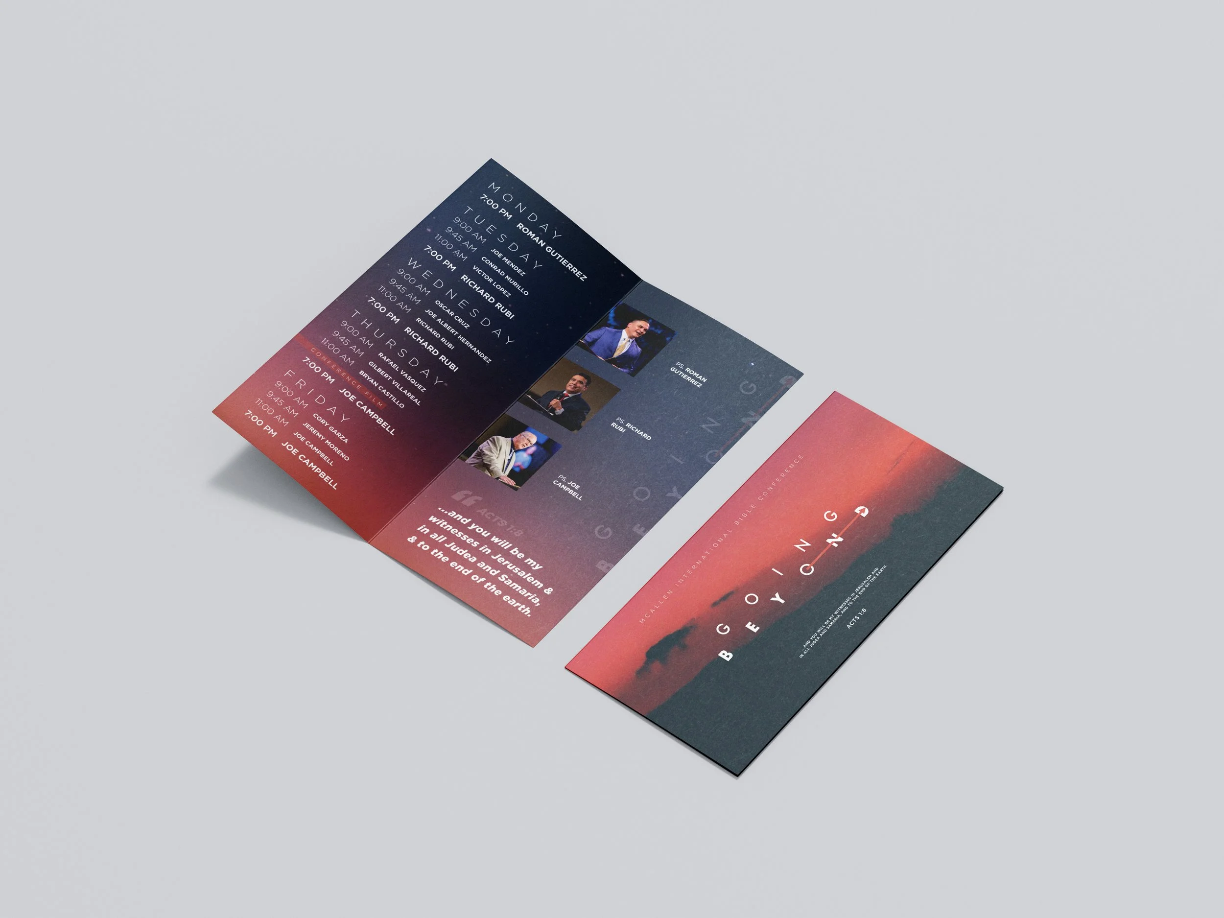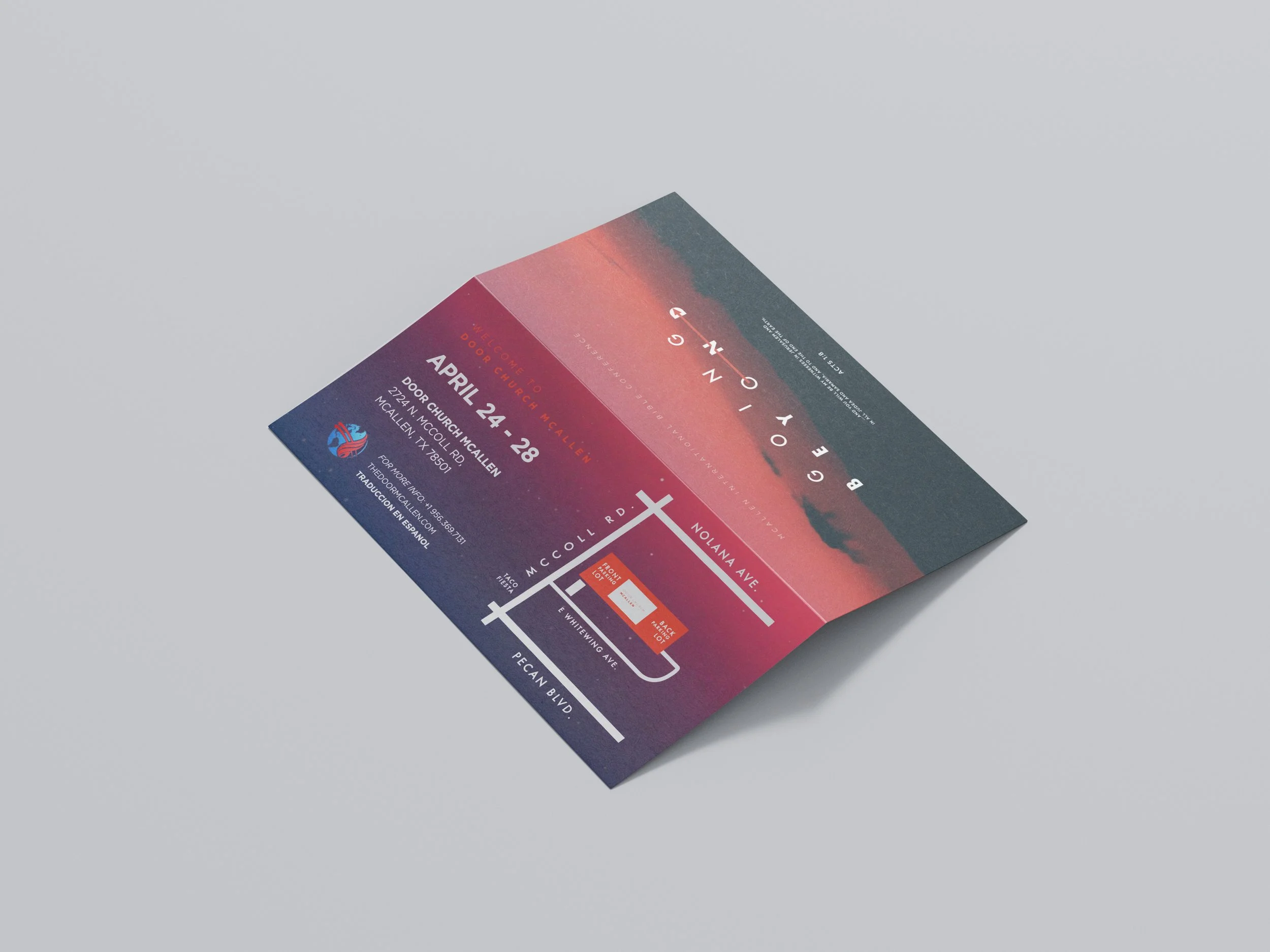 Bible Conference: Going Beyond is an international conference hosted by the Door Church in McAllen, Texas. This international conference hosts up to 1,000 guests every year. The theme of this conference was Going Beyond. The deliverables for this project included digital graphics, printed brochure, signage and a social media campaign.